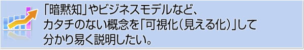 製品・サービス説明や研修ビデオで数多くの図やグラフを製作してきたデザイナーやイラストレーターが概念を「カタチ」にします。 まずはヒヤリングの結果を図式化し、それをどこまで映像でシンプルに表現できるかを検討します。そこに時間軸を導入し、動きを付けることで理解が早まるよう工夫します。 暗黙知やビジネスモデルなどの概念を可視化(図解)して、さらにナレーションや字幕スーパーで補い、分かり易く説明します。